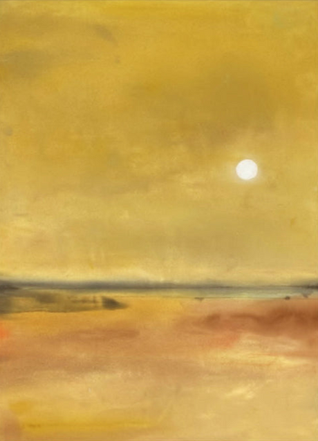 • Two abstract artworks from the collection Between Soil and Sky by Danielle Hutchens on a wall with a blurred person in the foreground.