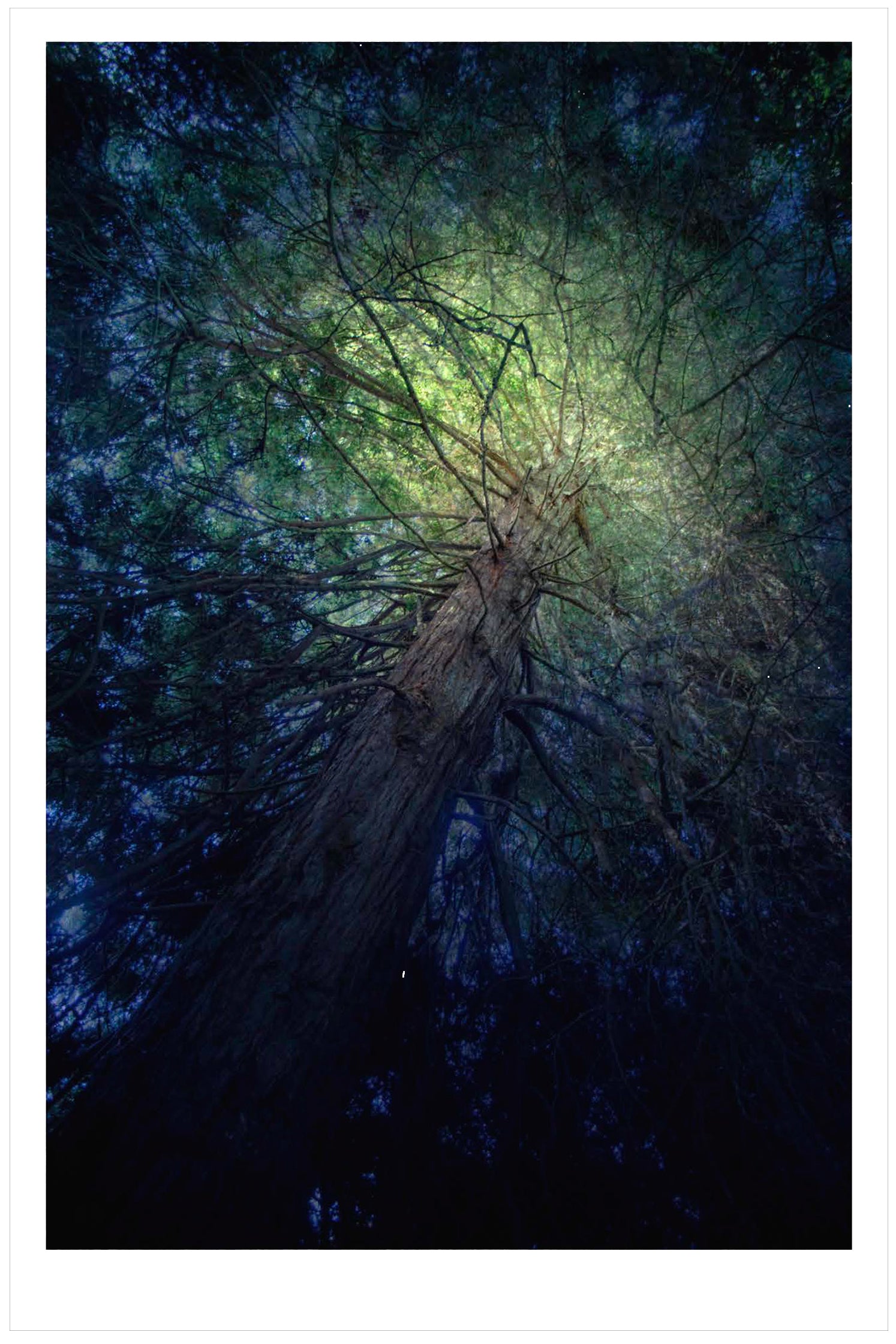 A result of a six-week photographic exploration of trees and vistas, each final photograph is the result of hours of production work combining multiple exposures and layering as one image–with evocative results: where the mind floats between space and time for one moment.