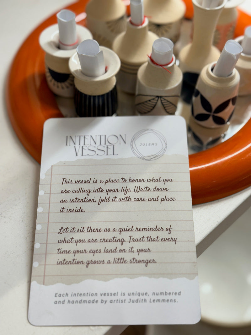 Julems made vases in miniature with her signature designs! This vessel is a place to honor what you are calling into your life. Write down an intention, roll it with care and place it inside your mini vase.