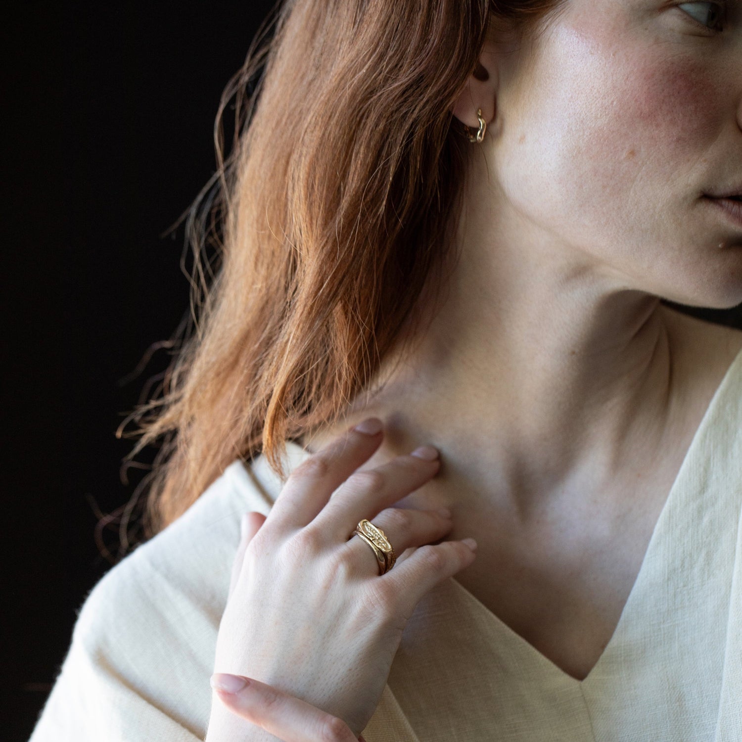 Organic textured and undulating 14K yellow gold huggies to wear everyday–they hug the ear lobe and click into place without backs. Also available in mini. Live, play, sleep in them!