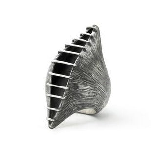 When you like a bold big ring... This dramatic elongated pod of polished bands of silver wire are constructed over a heavily etched silver container which opens slightly, revealing an oxidized interior. Sounds complicated, but it's as light as air and packs a big statement.