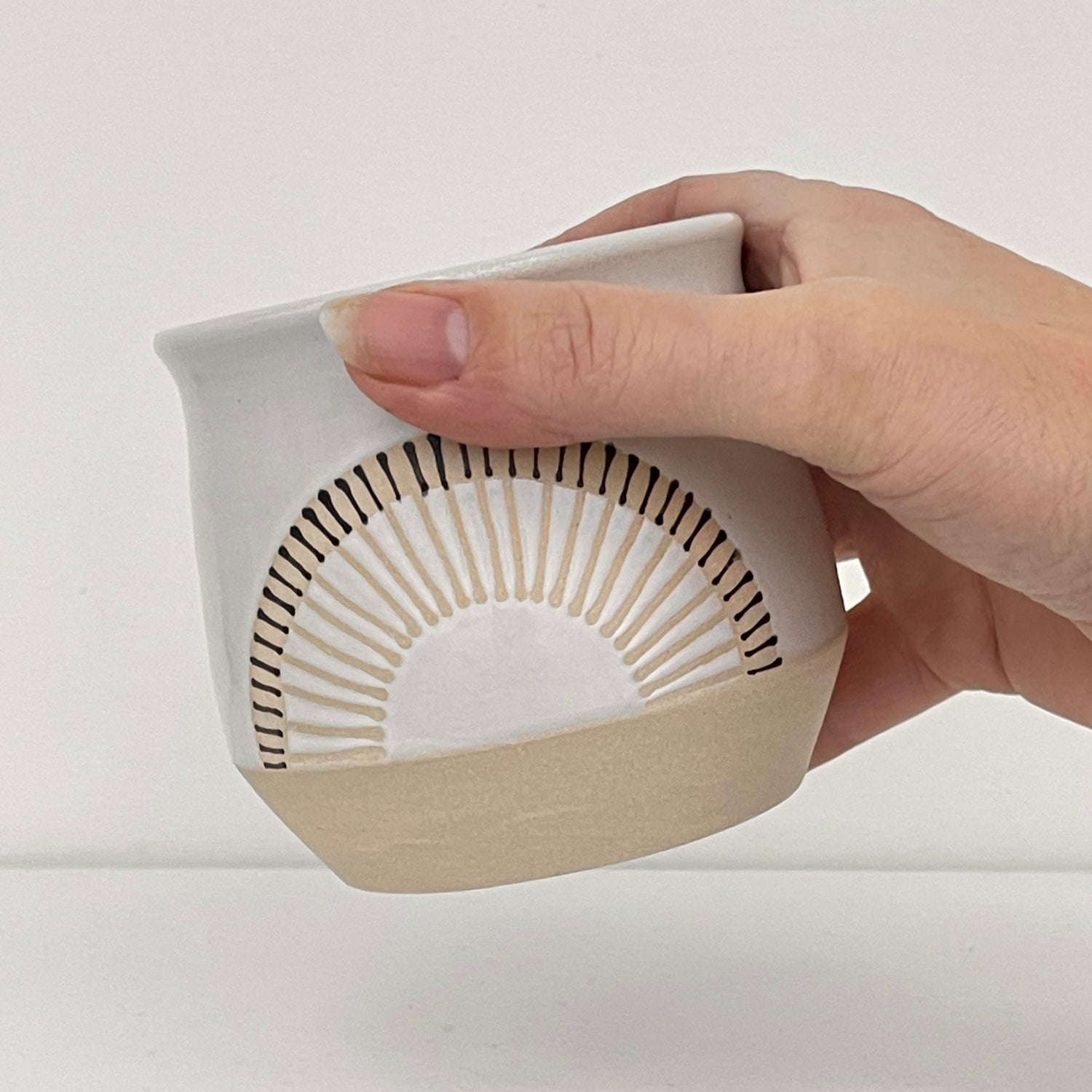 Get cozy with a warm cup, wheel thrown and decorated with a Scandinavian aesthetic by Julems Ceramics. This substantial beauty of a cup, tumbler or handle-less mug comes in 10oz to hold your favorite beverage or soup. We love the double rays pattern that brings the rainbow to your everyday.