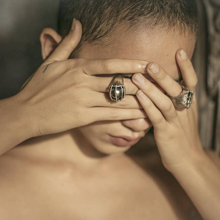A luminous, natural inky-black colored Tahitian black pearl is enclosed in a heavily etched container, held in place by parallel bands of high polished silver. An edgy and elegant cocktail ring that captures the light and reflects an iridescent halo against the sterling backdrop.