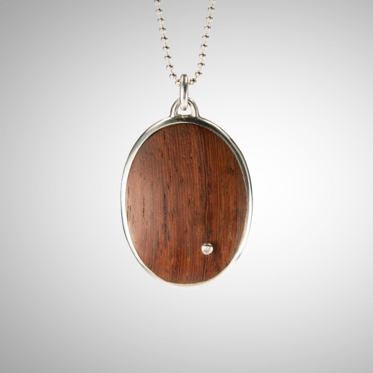 Jeffrey expands his wood collection with a stunning statement necklace using reclaimed wood, gorgeously reused. He cuts the wood to best feature the beauty of the graph lines, from creamy brown to pink-brown. He also makes a setting for a single diamond and pins it through the wood, while setting the two in a large oval sterling setting on chain.