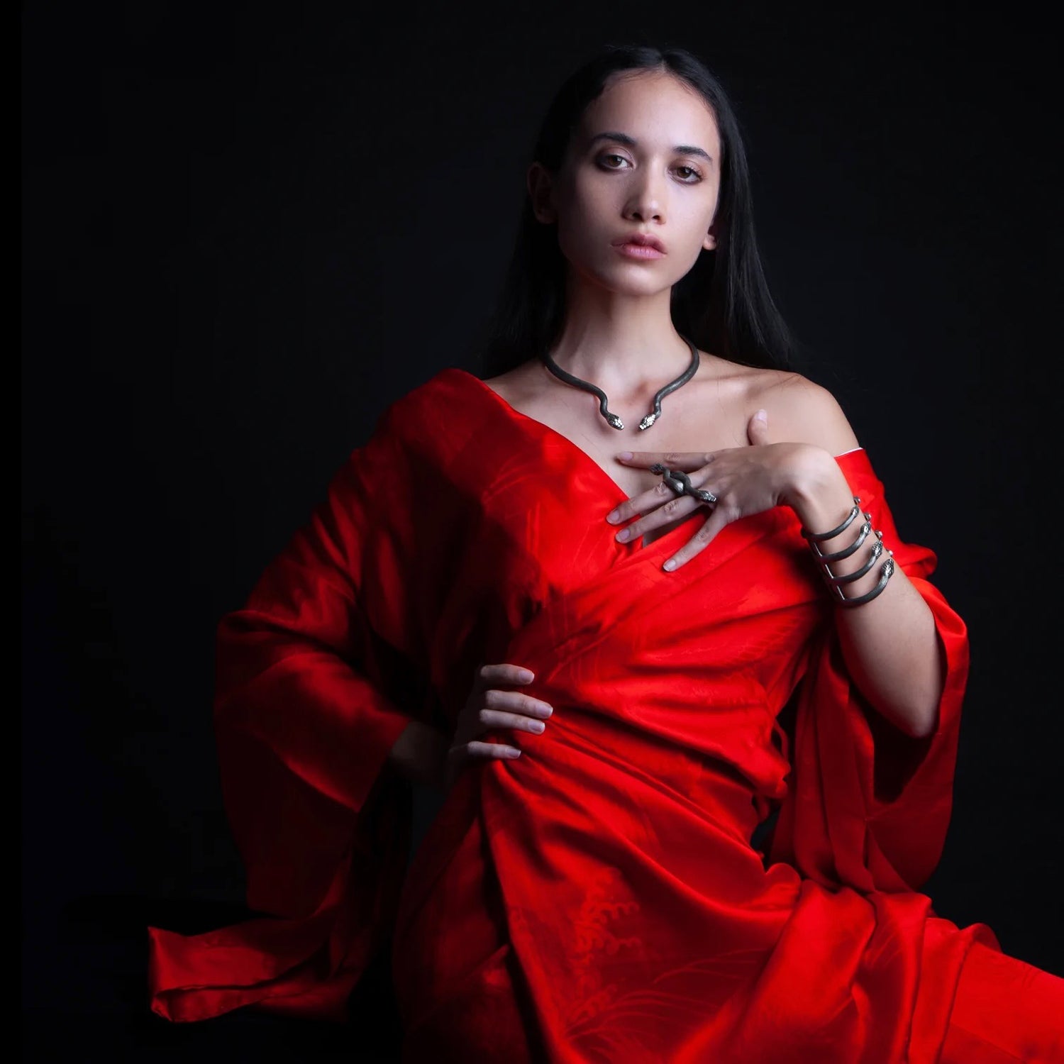 The body of a two headed serpent weaves its way around your neck and meets at your collar. Fierce as anything! Love this? Try the ring and cuff!
