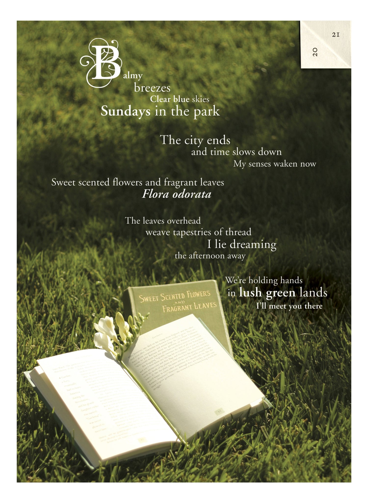Balmy Days & Sundays is a green floral perfume that recalls perfect moments on a relaxing weekend, lying in the grass, breathing the smells of sweet scented flowers and fragrant leaves. As the dappled light flickers through the pale green of overhead branches, this beautiful elixir of fresh botanical scents mingles the green notes of foliage and grass with the sweet scent of yellow freesia, honeysuckle and rose.