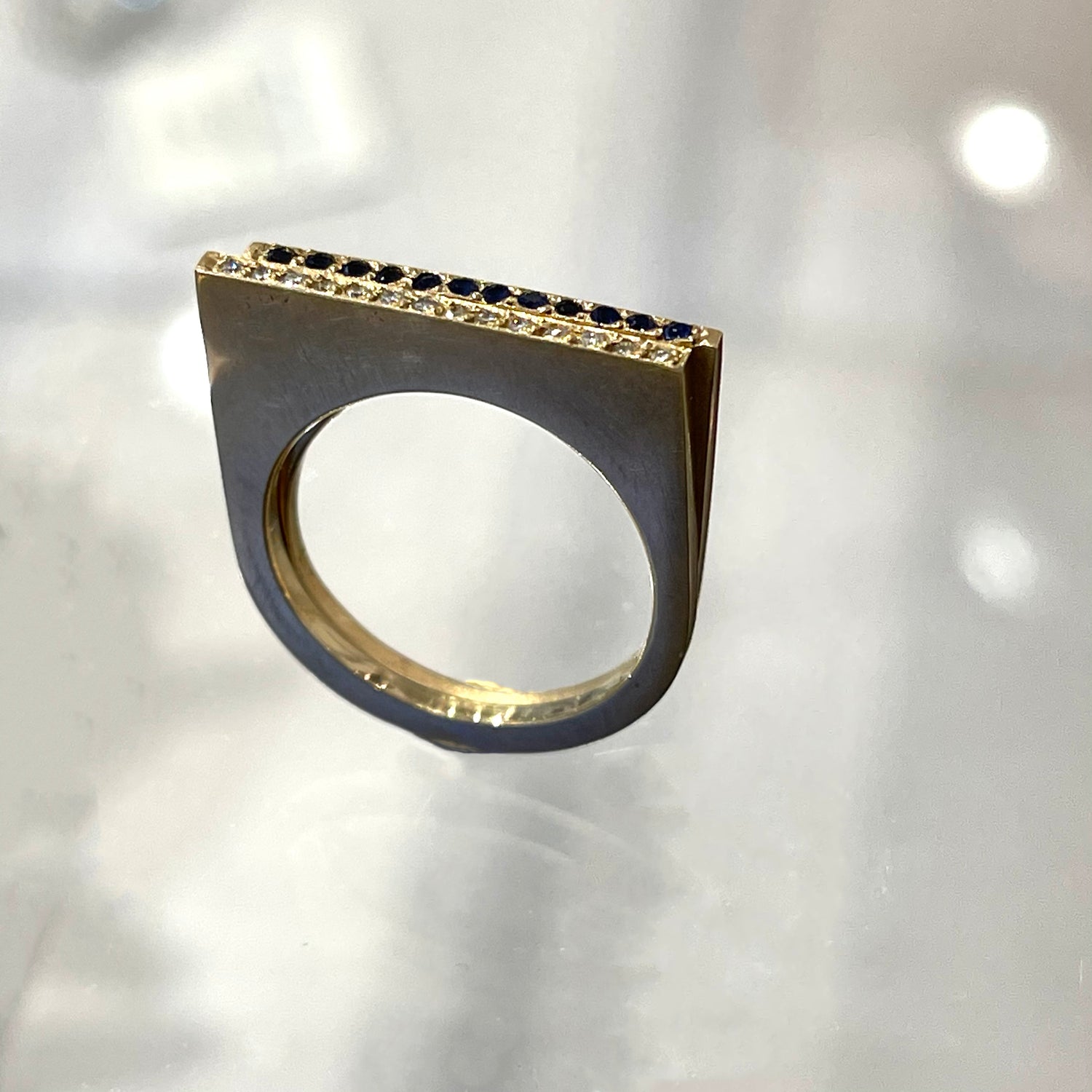 Add dramatic height and sparkle to your stacking rings with Jeffrey's super flat skinnys encrusted in diamonds or colorful gems. Inspired by beautiful bon bon desert plating, Jeffrey designed a unique proportion and stunning surface in mixed metals with pave set diamonds and gems. Wear 1 alone or stack 3 or 4 for ever-changing and stunning combinations.