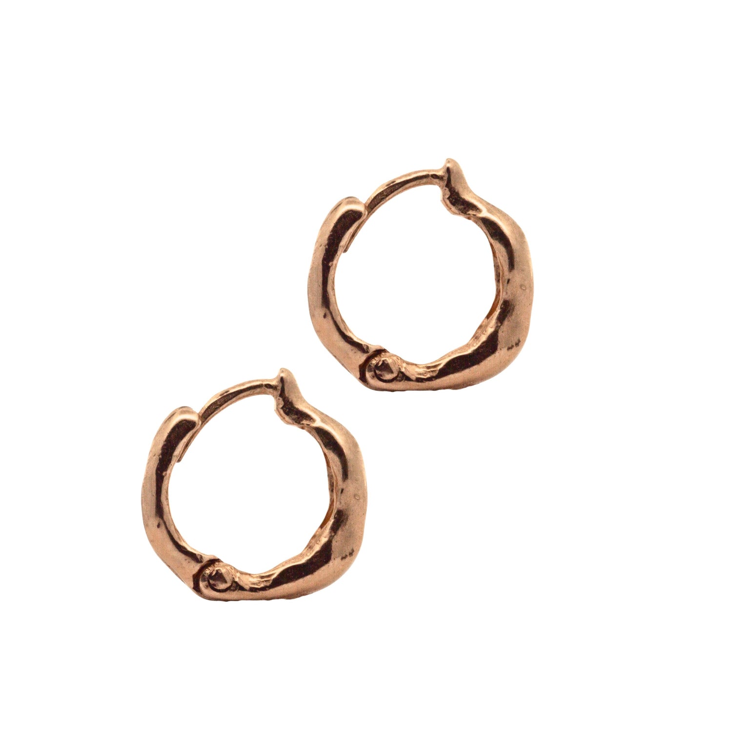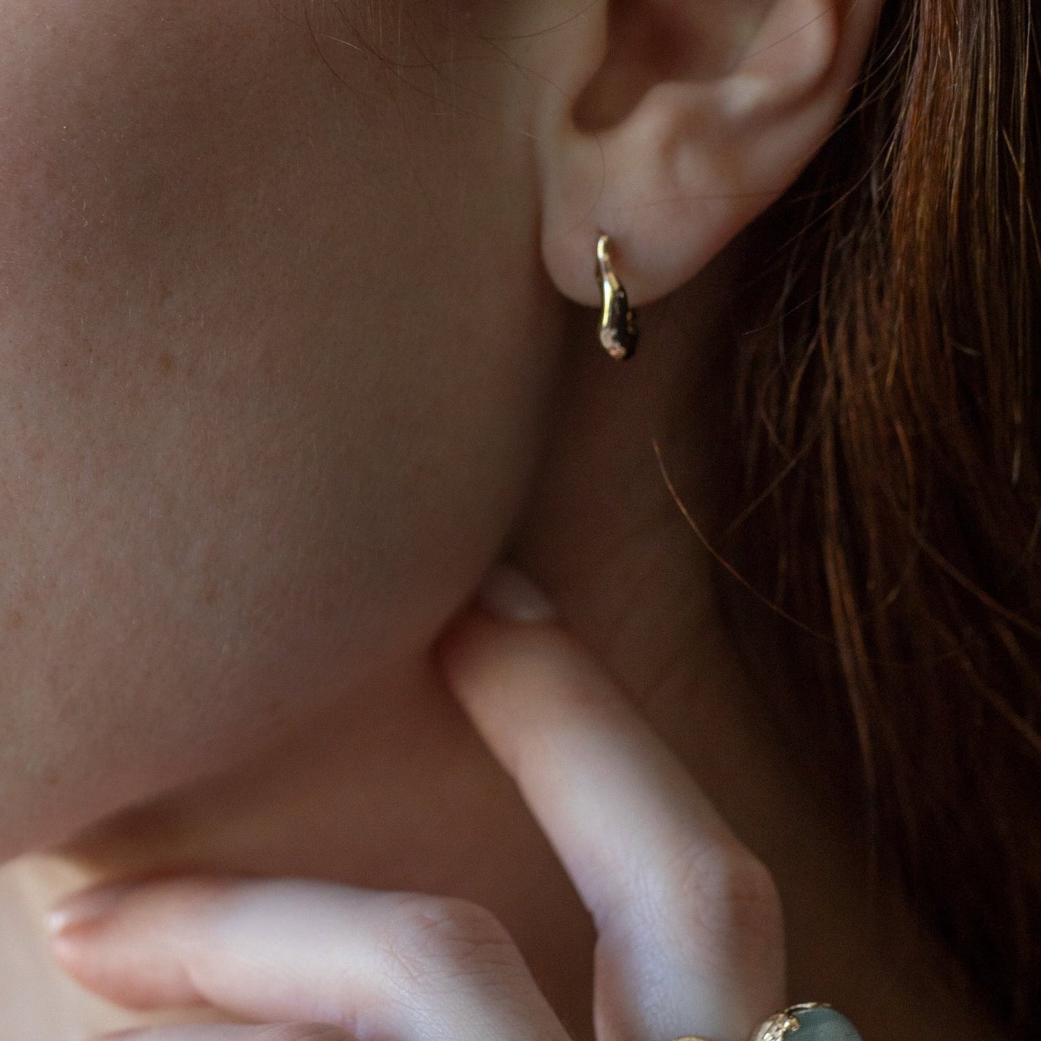 Organic textured and undulating 14K yellow gold huggies to wear everyday–they hug the ear lobe and click into place without backs. Also available in mini. Live, play, sleep in them!