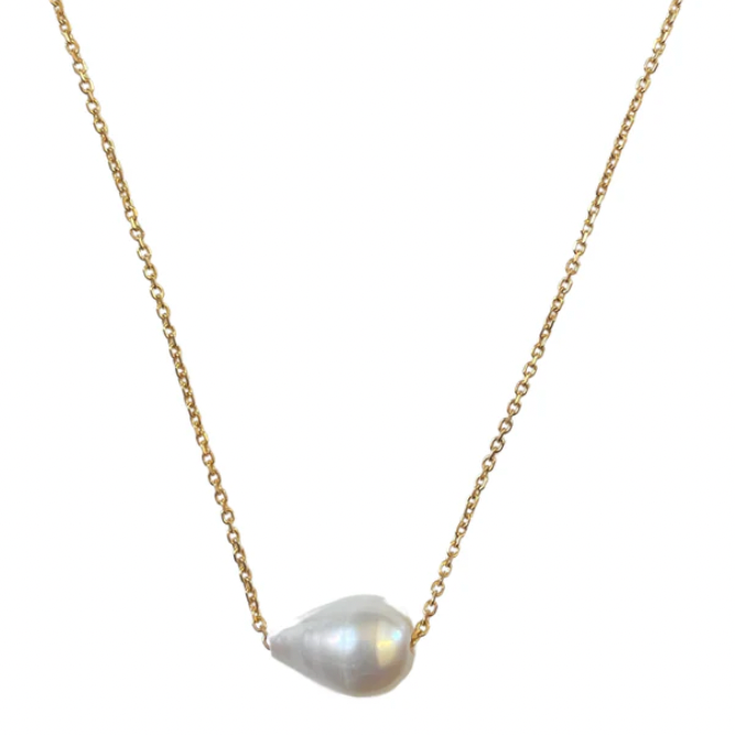 A layering freshwater pearl in a horizontal pill shape. For everyday and with other necklaces. Yellow combines her South African upbringing with a global worldview and pop art images of street culture to create modern jewelry.