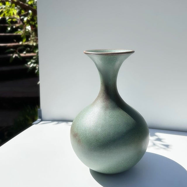 Inspired by the colors of the sea, this vase in a light stoneware and glazed deep green brings bold color to your book shelf! The No 52 ceramic vase is wheel-thrown and pairs with Dana Chieco's full line of ceramic vessels as a contrast or a complement.