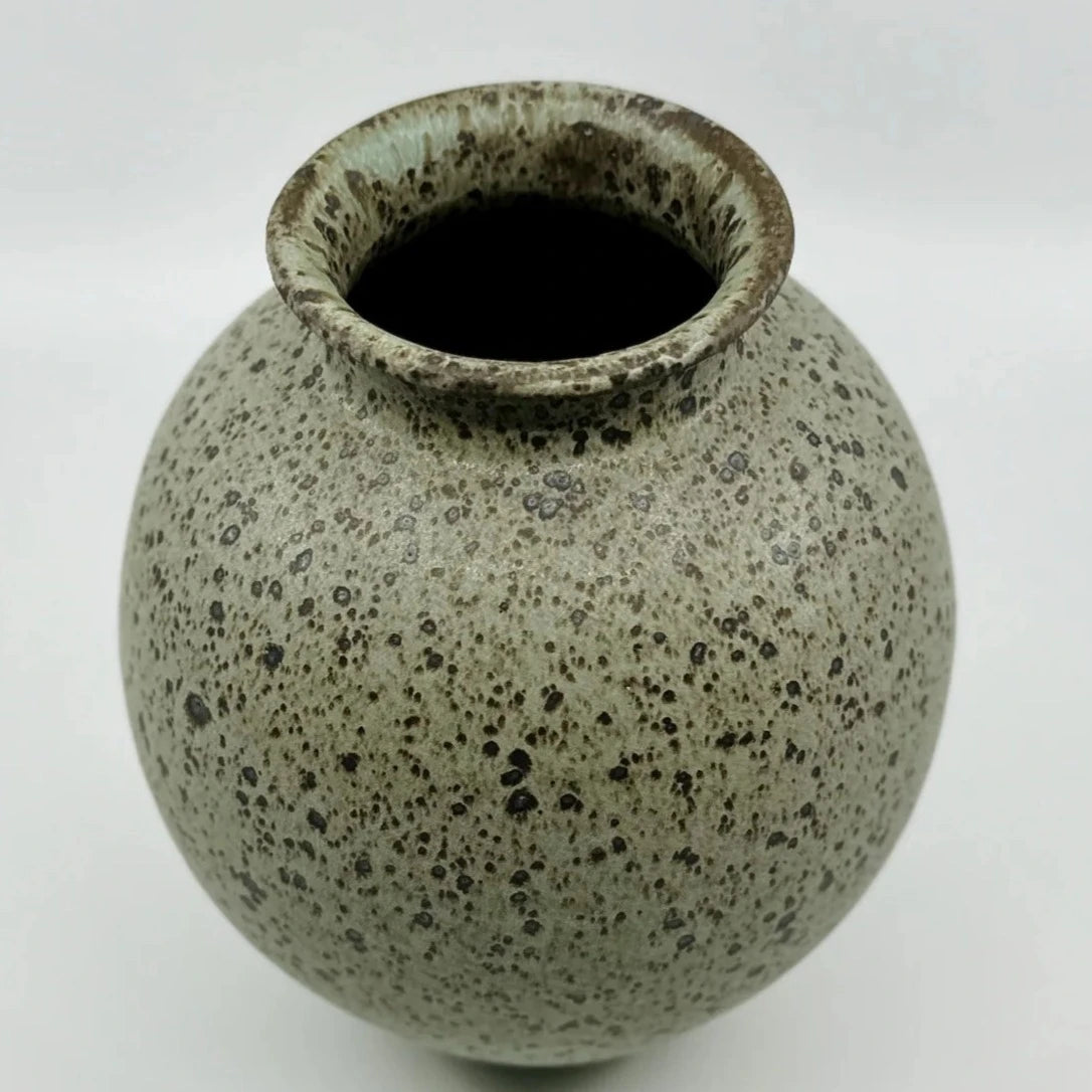 Pairing with the Bottleneck vases 23 and 24, this Dana Chieco No 36 wide mouth vase provides ample room for a peony bouquet! The ceramic vase is wheel thrown with deep speckled clay and glazed in blue-pistachio tone. A one of a kind ceramic vase that is a testament to the timeless beauty of heirloom pottery.